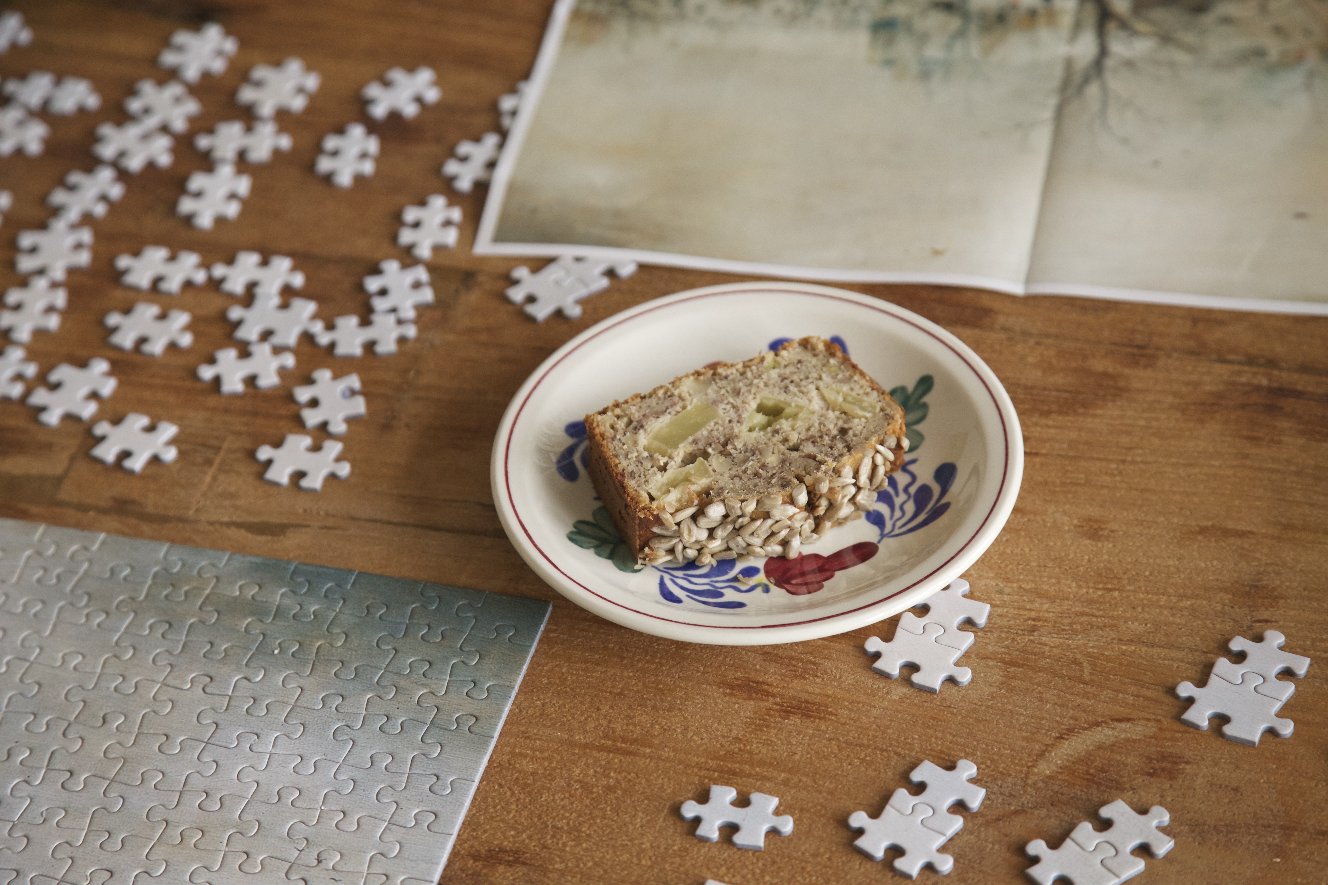 5. Vet het cakeblik in en bekleed met bakpapier. Giet hier het beslag in, strijk glad en strooi er de zonnebloempitten overheen.