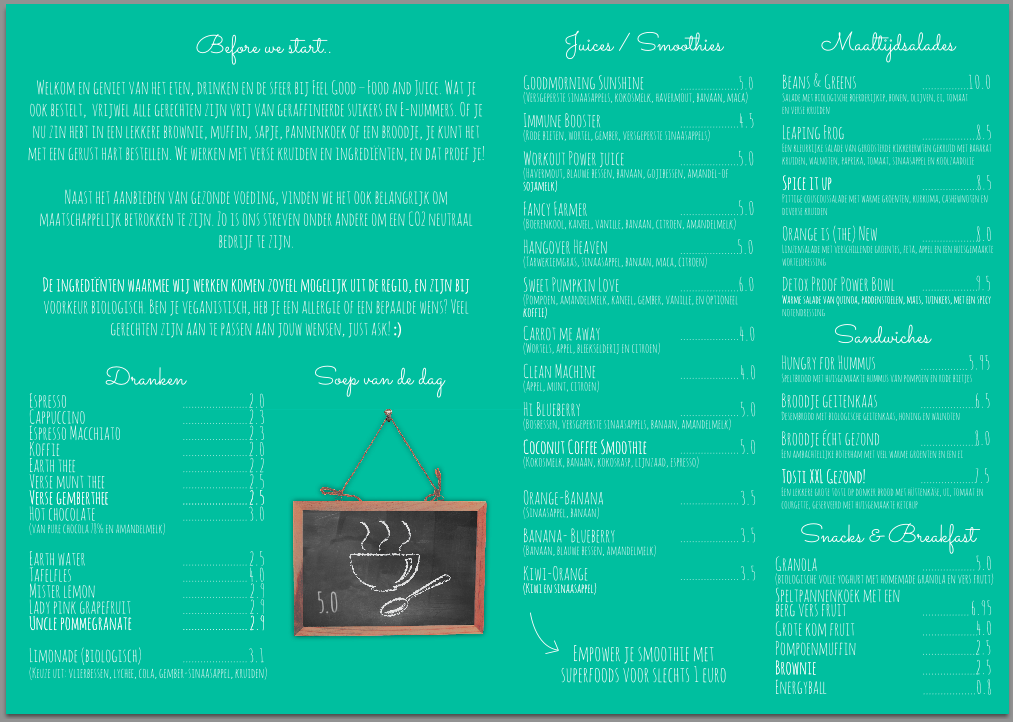 Gelukkig zijn er wel tentjes te vinden waar iets te kiezen valt, ook als je geen suiker wilt eten. Zo was ik afgelopen week een keer bij de Feel Good in de Oude Kijk in’t Jatstraat (Groningen). Je kunt hier koffie drinken, ze maken allerlei spannende sapjes en taarten en je kunt er ’s avonds eten. Ik was positief verrast doordat alles wat ze maken vrij is van geraffineerde suikers (en E-nummers). Het kan dus wel!