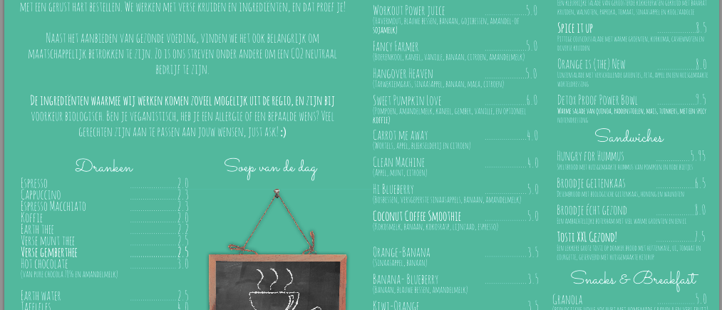Wat ik er heb gehad? Een koffie, een sapje en een brownie op basis van bruine bonen. De brownie vond ik een beetje spannend (bruine bonen klinken niet heel erg sexy), maar hij was erg lekker en vol van smaak. Het is natuurlijk wel een andere zoet-beleving dan wanneer ergens suiker in zit, dat wel. Maar misschien moeten we daar met z’n allen gewoon ook nog een beetje aan wennen, aangezien suiker als zoetstof en smaakmaker in zo veel producten verwerkt wordt en er over het algemeen vrij weinig alternatieven worden aangeboden.