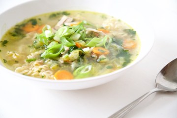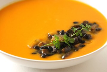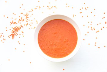 Zoete aardappel rode linzensoep met knoflookcroutons √