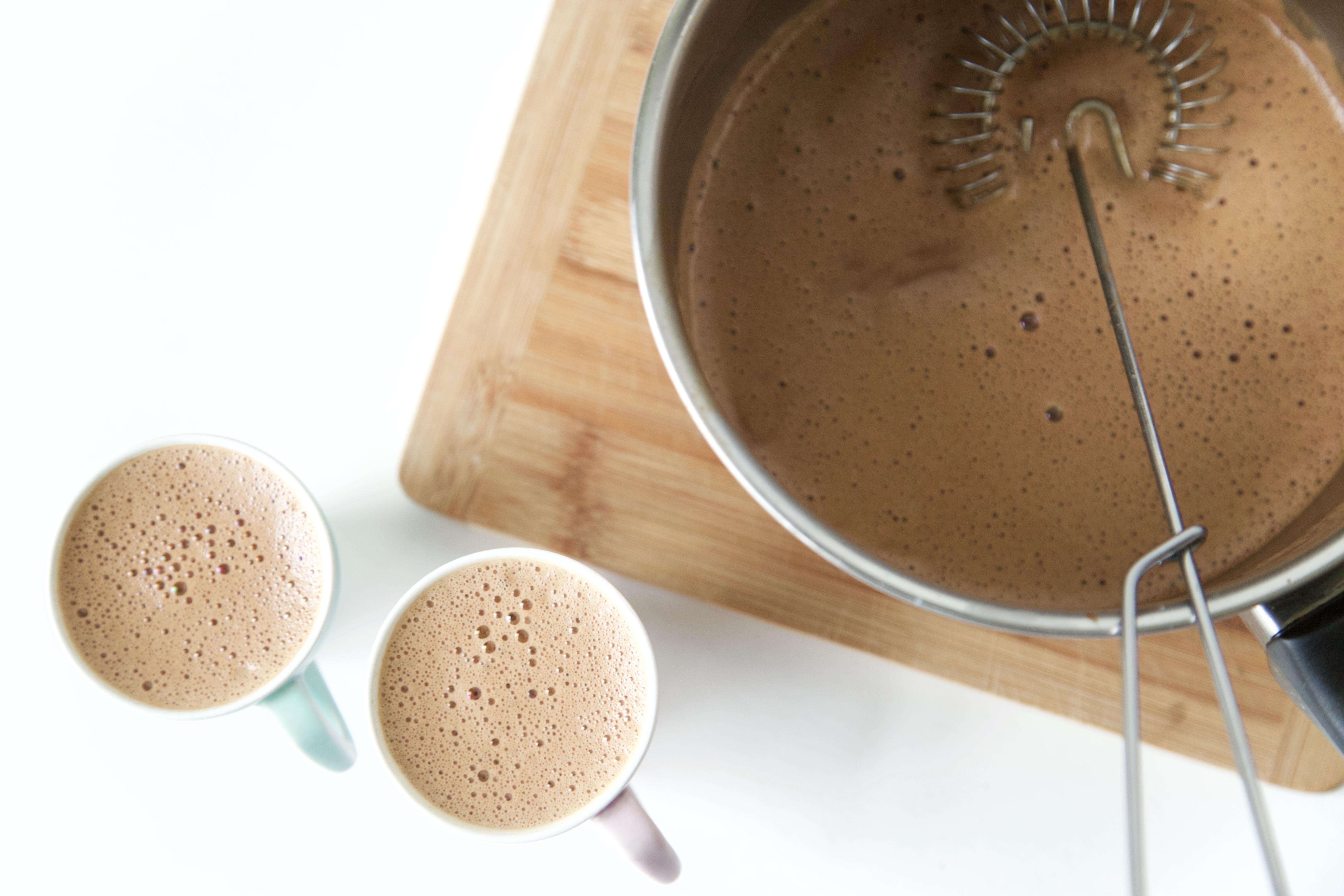 4. Verwarm de chocolademelk tot deze heet is, maar niet kookt. Klop met een garde tot er kleine belletjes ontstaan. Serveer direct!