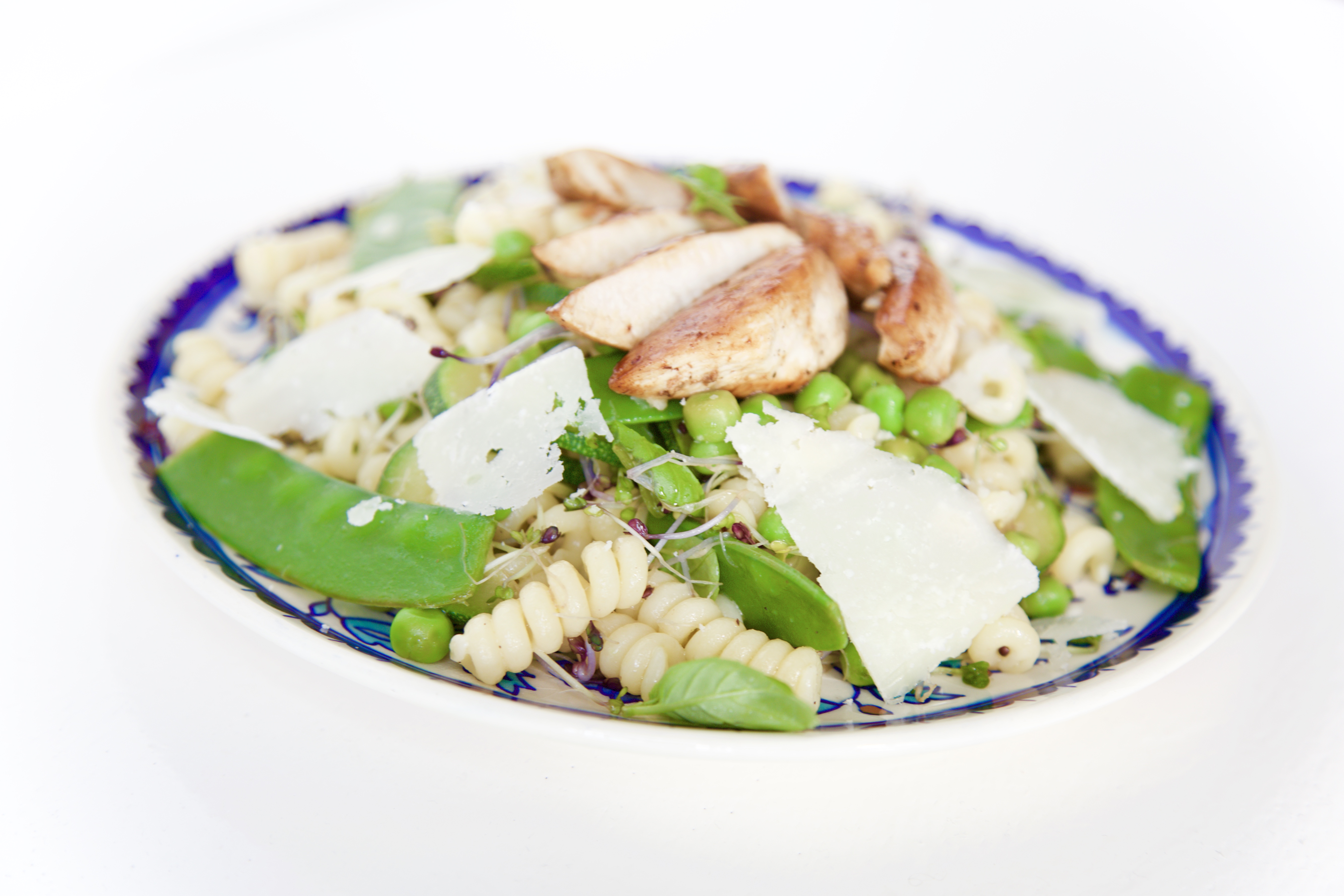 5. Schep de salade in de borden, garneer met de verse basilicum, geschaafde pecorino en de kip. Eet smakelijk!