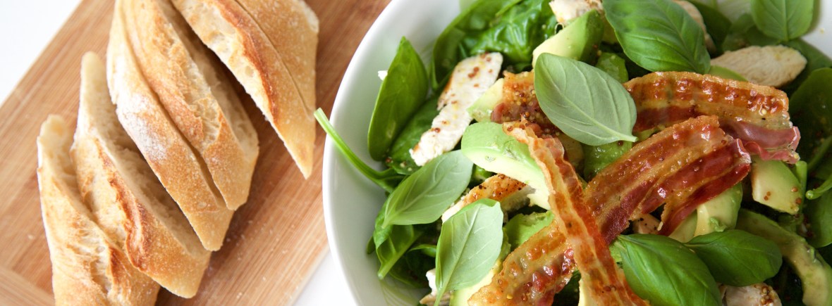 Misschien is deze wel een beetje voor de mannen, een echte powersalade met gegrilde kipfilet en bacon. De spinazie, groene asperges en avocado maken de salade lekker zomers en uitermate gezond. Perfect voor de lunch, na een work-out of voor ’s avonds, geserveerd met wat knapperig stokbrood.