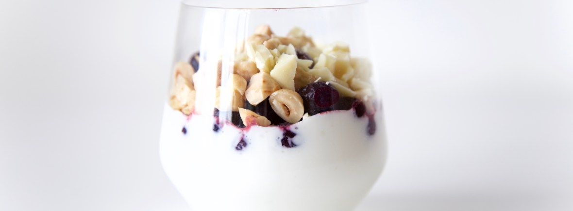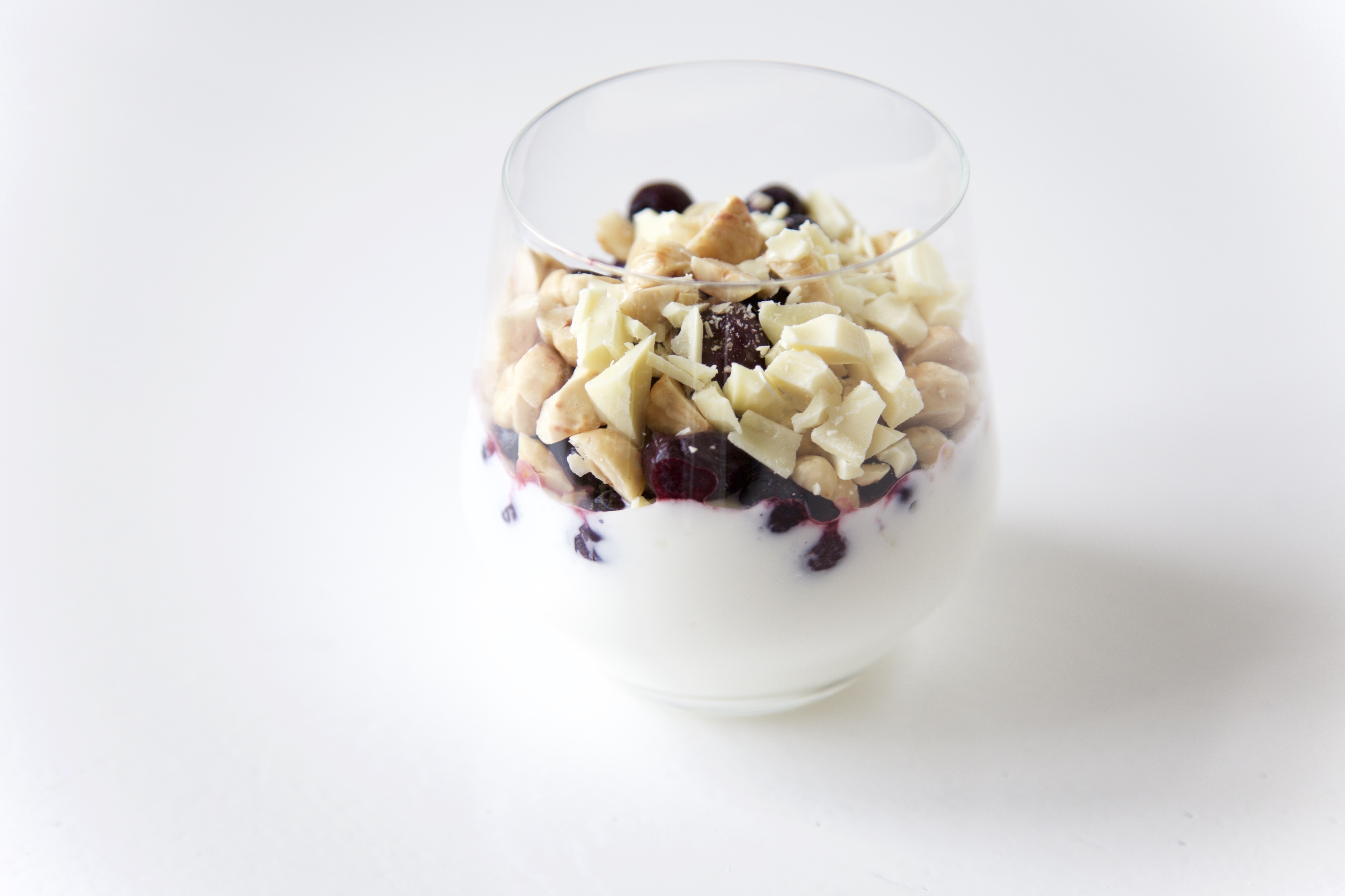 3. Schep de Griekse yoghurt in 6 glazen. Strooi hier de helft van de witte chocolade overheen. Verdeel dan de bevroren blauwe bessen er over. Maak af met de geroosterde hazelnoten en eindig met de andere helft van de witte chocolade. Zet goed afgedekt in de koelkast tot gebruik. Geniet ervan!