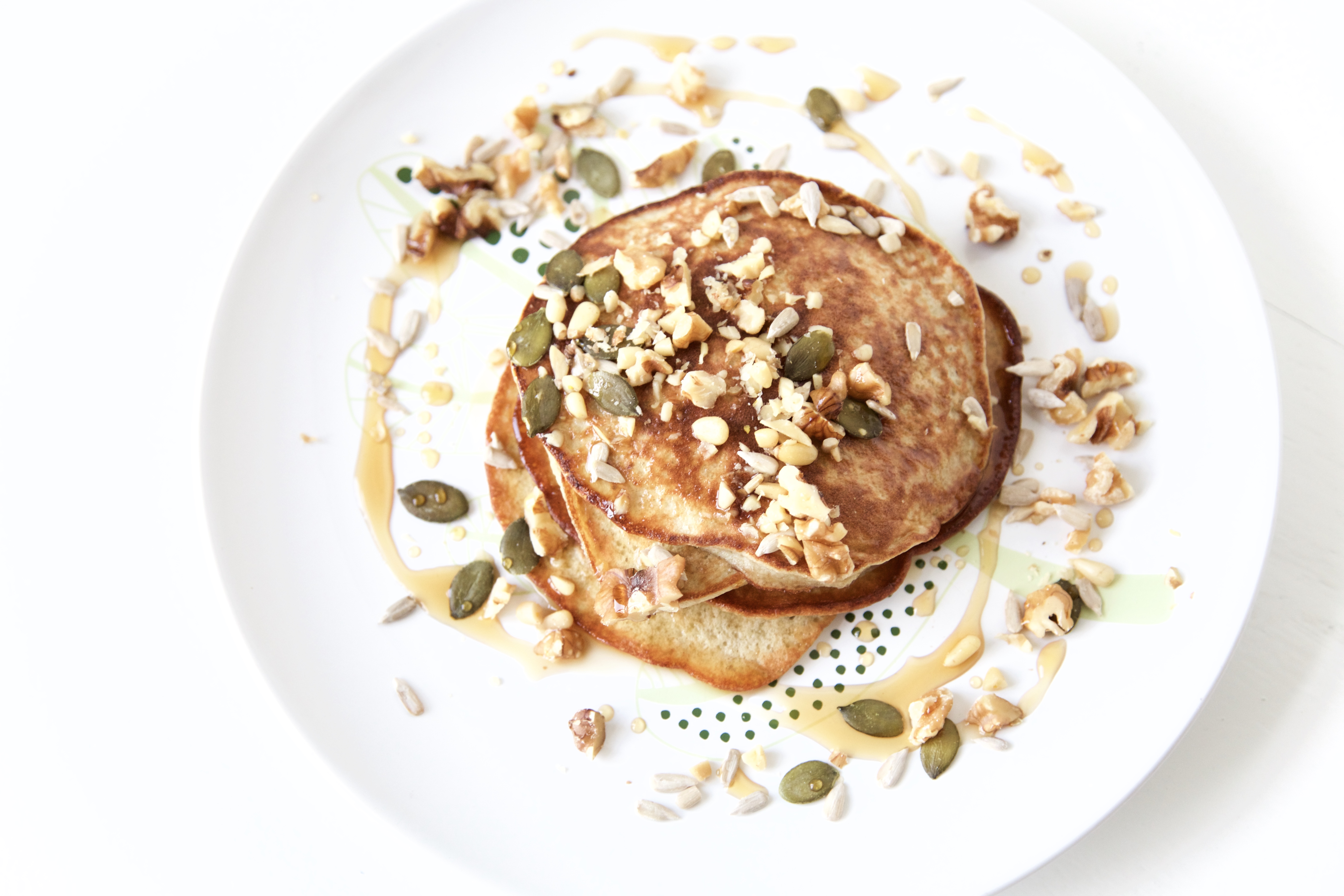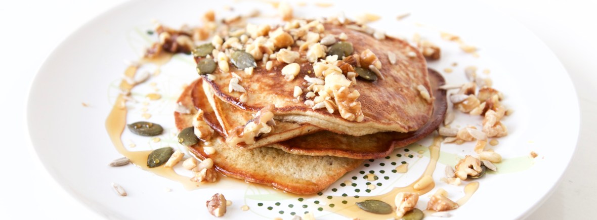 Serveer de pannenkoekjes met noten en zaden en kokosbloesemsuiker, agave siroop of maple syrup. Enjoy!