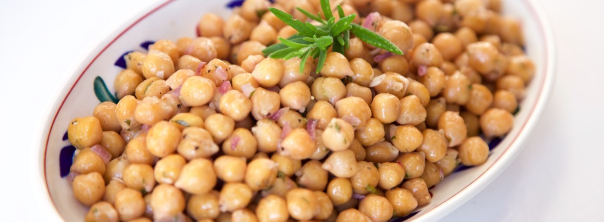 Fruit de ui en de knoflook met de olijfolie in een koekenpan met anti-aanbaklaag. Voeg de rozemarijn toe en vervolgens de kikkererwten. Bestrooi met peper en zout. Bak de kikkererwten op redelijk hoog vuur voor ongeveer tien minuten. De kikkererwten zijn nu iets krokant en goudbruin. Warm serveren.