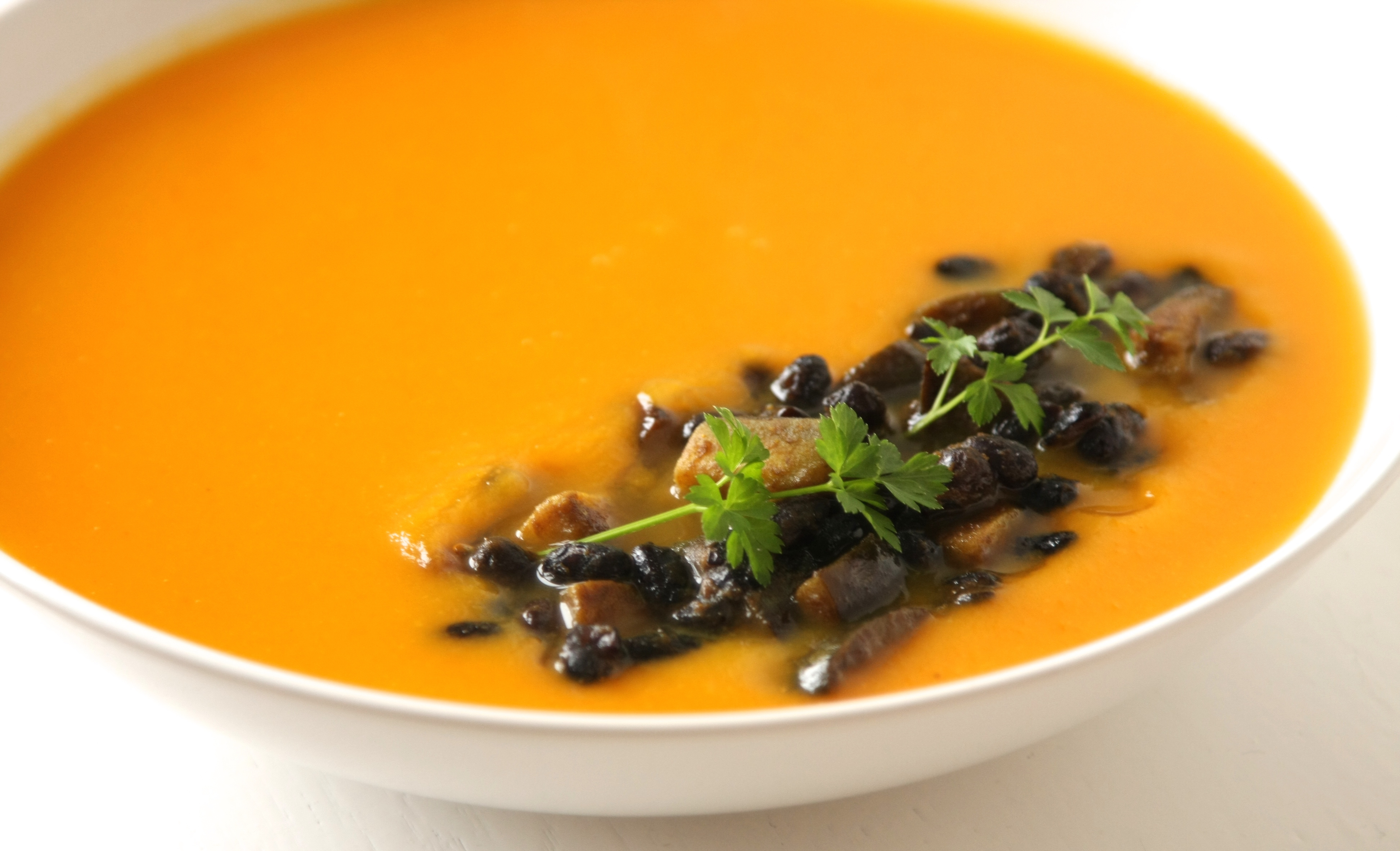 3. Als de blokjes pompoen, wortel en zoete aardappel zacht zijn (prik er even in met een vork om dit te checken) met een staafmixer de soep glad pureren. Eventueel nog wat water toevoegen tot de gewenste dikte. De soep mag redelijk dik blijven, zodat de topping er als het ware op blijft liggen. Afmaken met olijfolie en naar smaak versgemalen peper en zeezout.