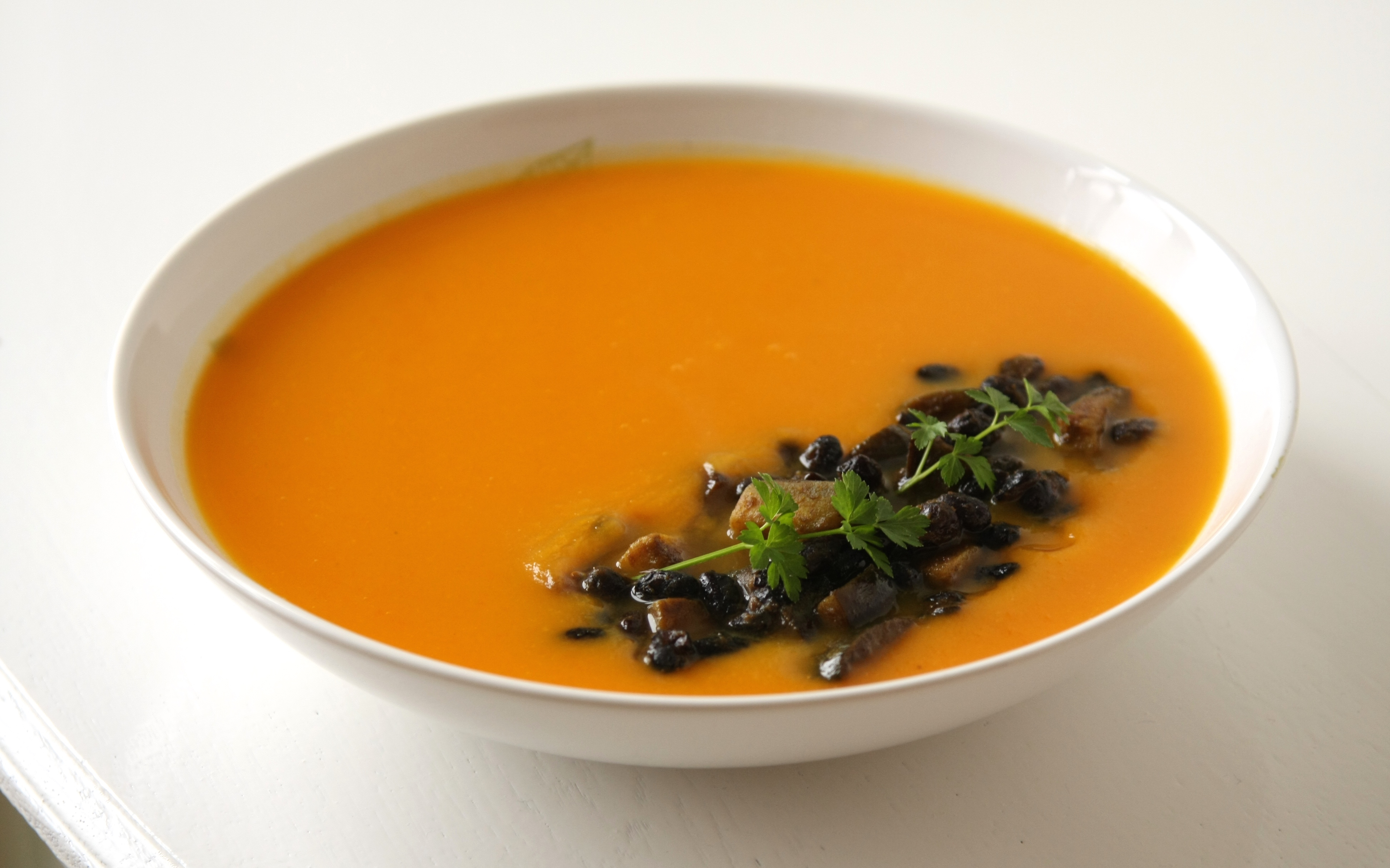 Ik maakte voorheen ook al vaak pompoensoep in de herfst (met tijm en crème fraîche), maar had er nog nooit een ‘topping’ bij gegeten. Deze soep is mede door de topping een uitstekende, voedzame maaltijd voor de koudere dagen. De zoete aardappel maakt de soep lekker romig. Het recept is erg simpel en de smaken zijn puur.