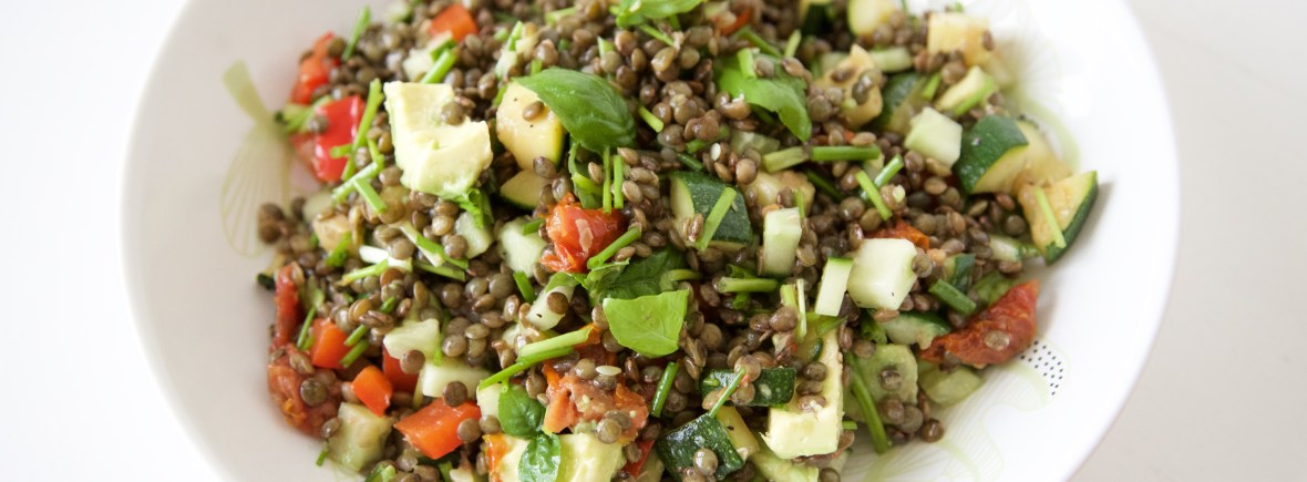 4. Doe de linzen, rode paprika, courgette, komkommer, semi-zongedroogde tomaatjes en de verse kruiden in een kom. Voeg de extra vergine olijfolie en het citroen sap toe. Breng op smaak met peper en zeezout en schep goed door. Voeg tot slot de avocado toe en schep voorzichtig nog een keer door.