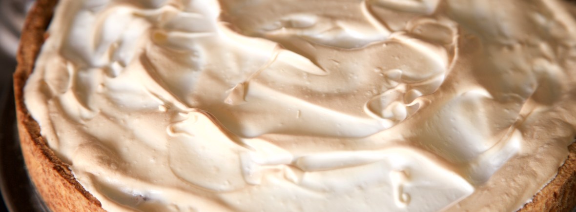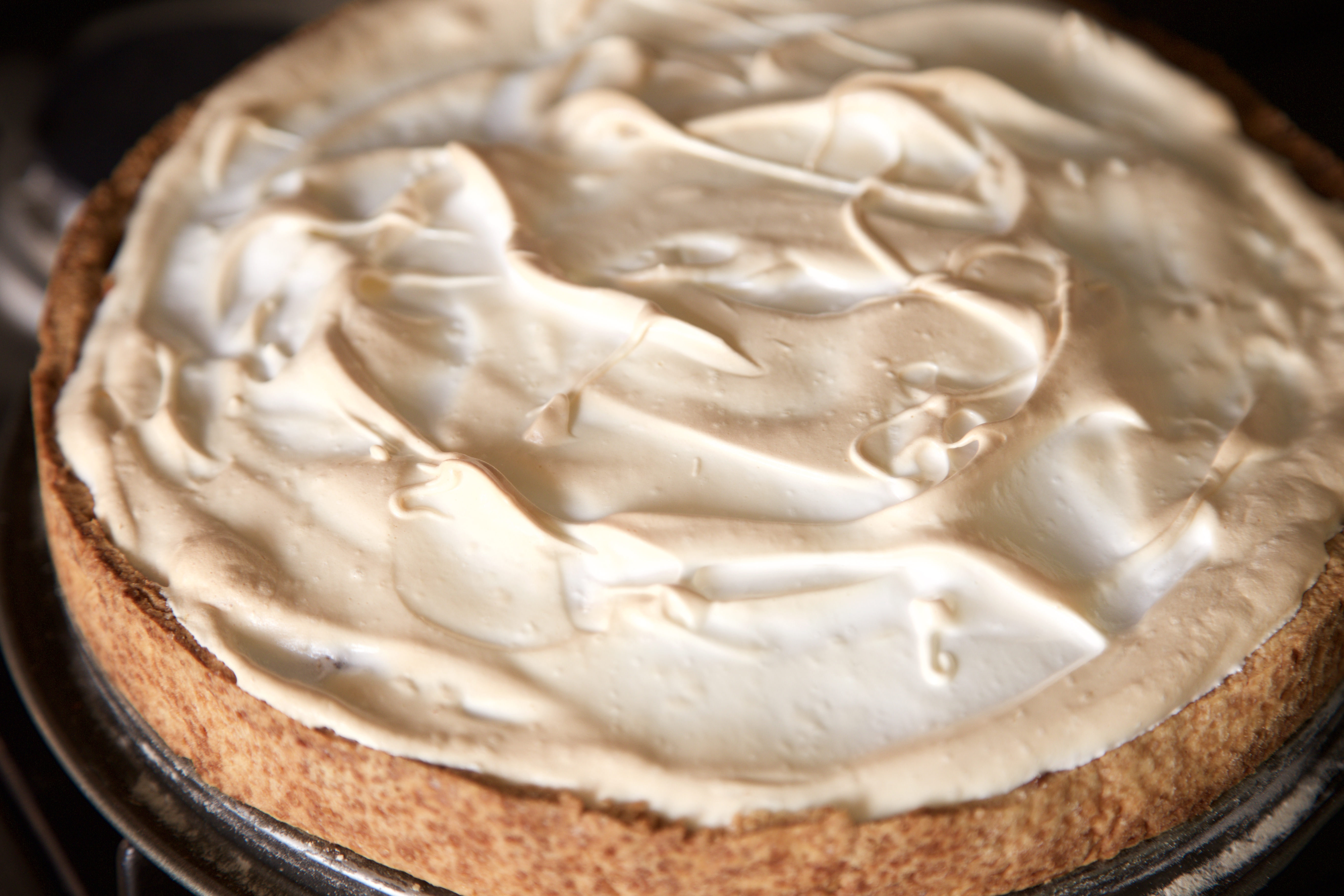 8. Verdeel het opgeklopte eiwit over de taart met een spatel en vorm wat pieken. Zet nu voor 15 minuten in de oven op 180 graden. Controleer tussendoor of de taart niet te snel donker kleurt. Laat iets afkoelen en serveer direct. Er gaan ongeveer 10 punten uit deze taart. Eet smakelijk!