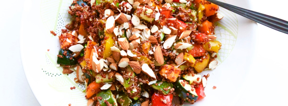 4. Haal de groente uit de oven. Doe de quinoa in een ruimte kom en voeg de geroosterde groente toe. Hak de peterselie fijn en voeg dit samen met de olijfolie toe. Pers de helft van de citroen boven de kom. Schep alles om en serveer met de geroosterde amandelen. Eet smakelijk!
