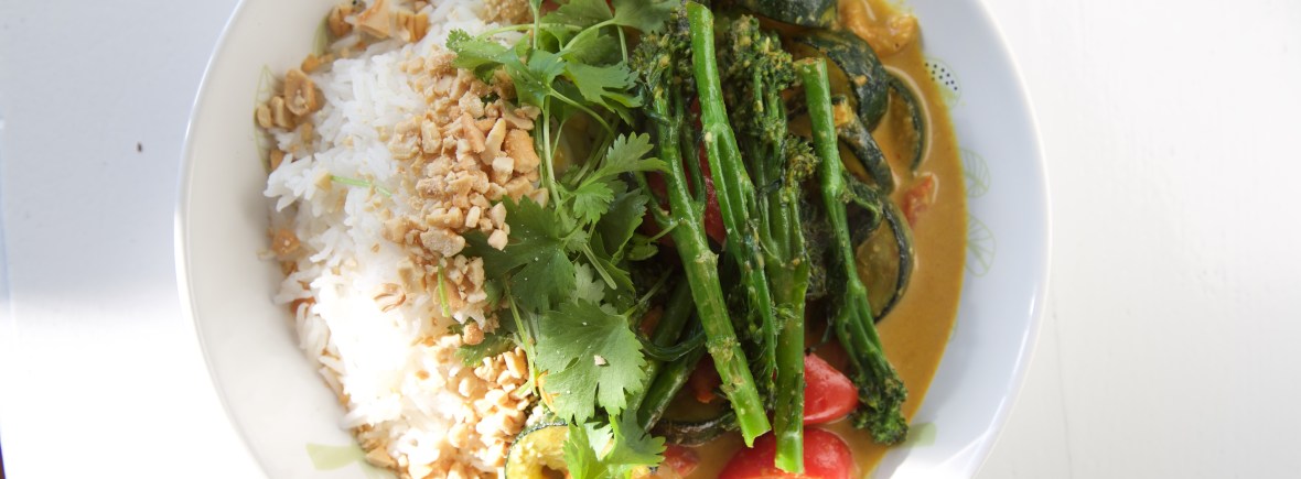 4. Serveer de rijst met de curry en bestrooi met verse koriander en eventueel wat kokosrasp. Eet smakelijk!