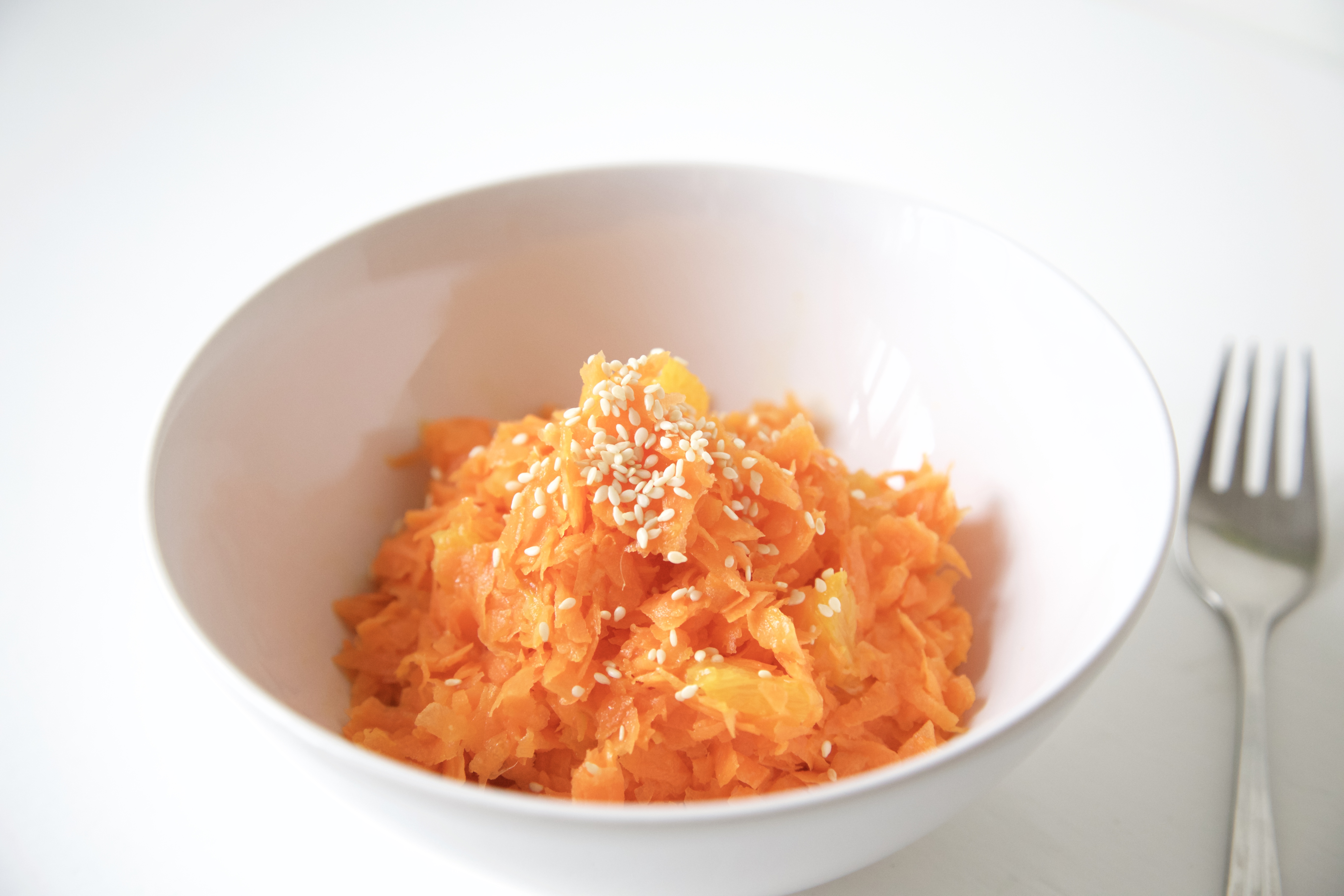 1. Schil de wortelen met de dunschiller en rasp ze. Doe in een kom. 2. Snijd de boven en de onderkant van de sinaasappel en snijd dan met een mes de schil er vanaf, met de bolling van de sinaasappel mee. Halveer de sinaasappel nu, verwijder eventuele witte draden in het midden en snijd de sinaasappel in kleine blokjes. Het sap dat op de plank blijft liggen giet je samen met de blokjes sinaasappel bij de wortel. 3. Pers de citroen en voeg het sap toe aan de wortel. Voeg dan de rijstolie toe en roer goed door. 4. Schil nu het stukje verse gember en rasp dit met een fijne rasp. Voeg toe aan de salade en meng alles nog eens goed door elkaar. 5. Rooster tot slot in een droge pan wat sesamzaadjes en garneer hiermee de salade. Eet smakelijk!