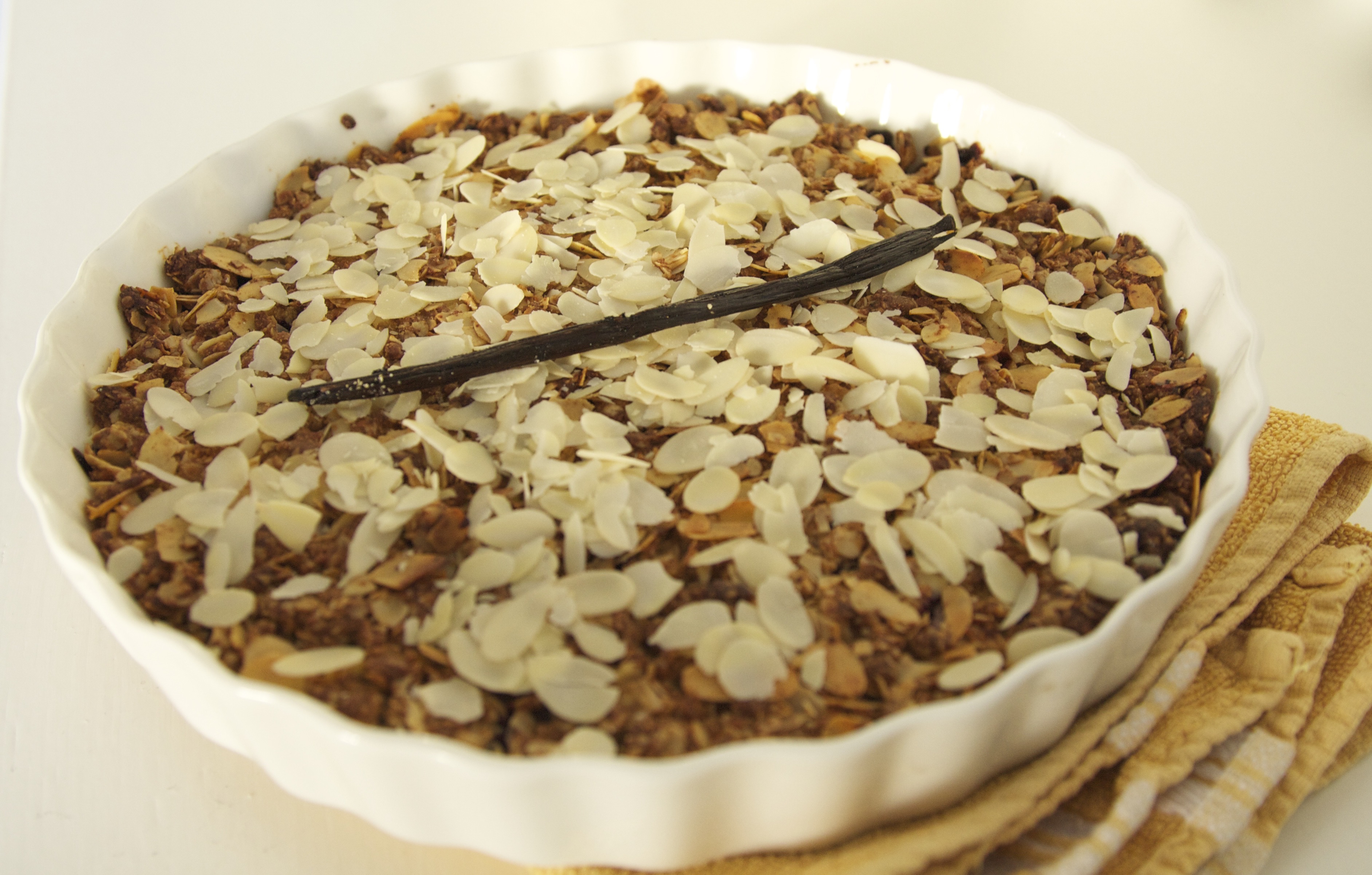 1. Verwarm de oven voor op 175 graden en zet de kokosolie er even bij in terwijl de oven opwarmt, zodat de kokosolie vloeibaar wordt. Meng hier de honing doorheen. Vervolgens het vanille stokje met een scherp mes doormidden snijden en de merg eruit schrapen. De vanille en de droge ingrediënten (amandelmeel, havermout, amandelschaafsel) nu ook door het mengsel roeren, totdat alles volledig gemengd is.