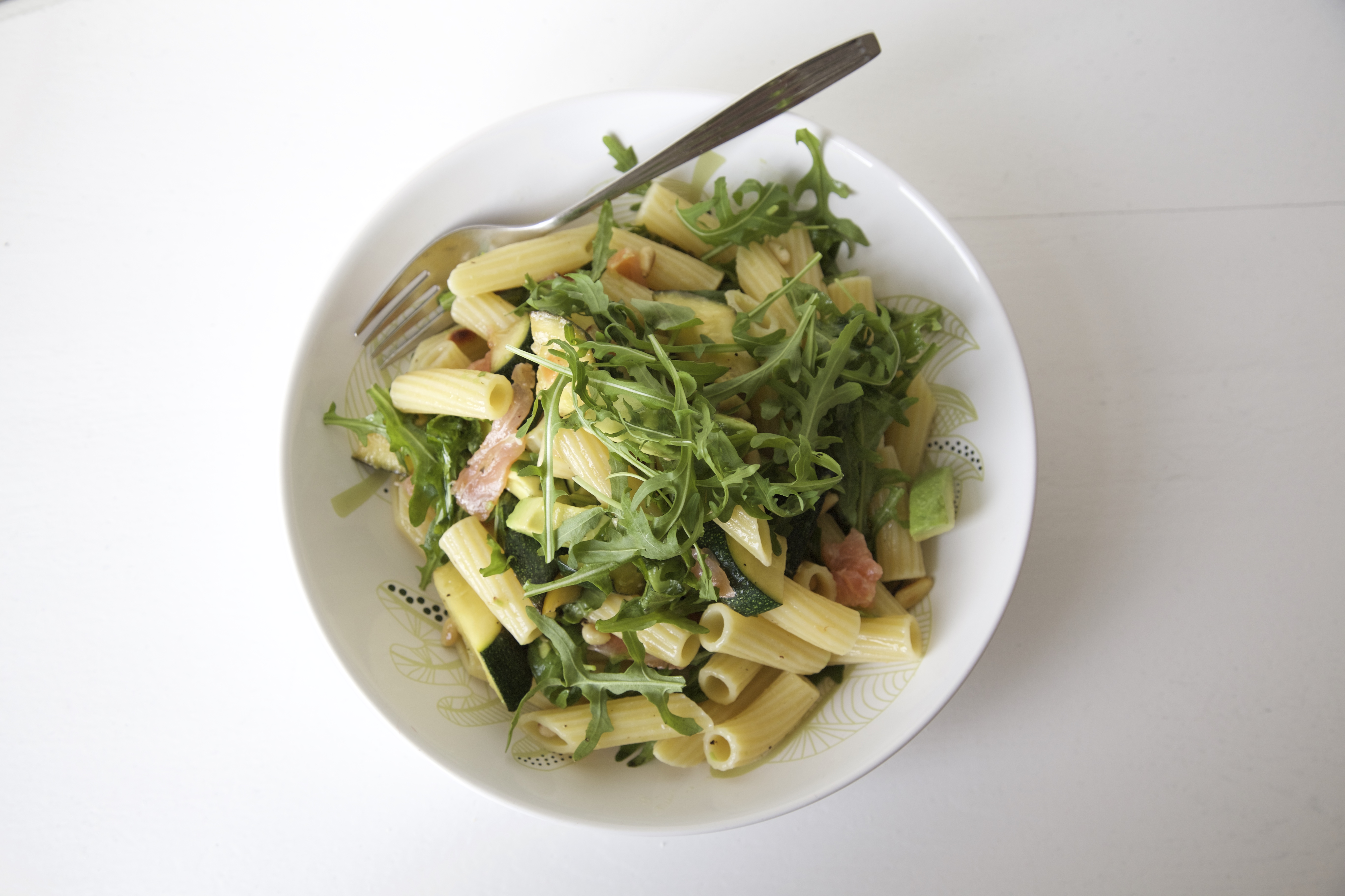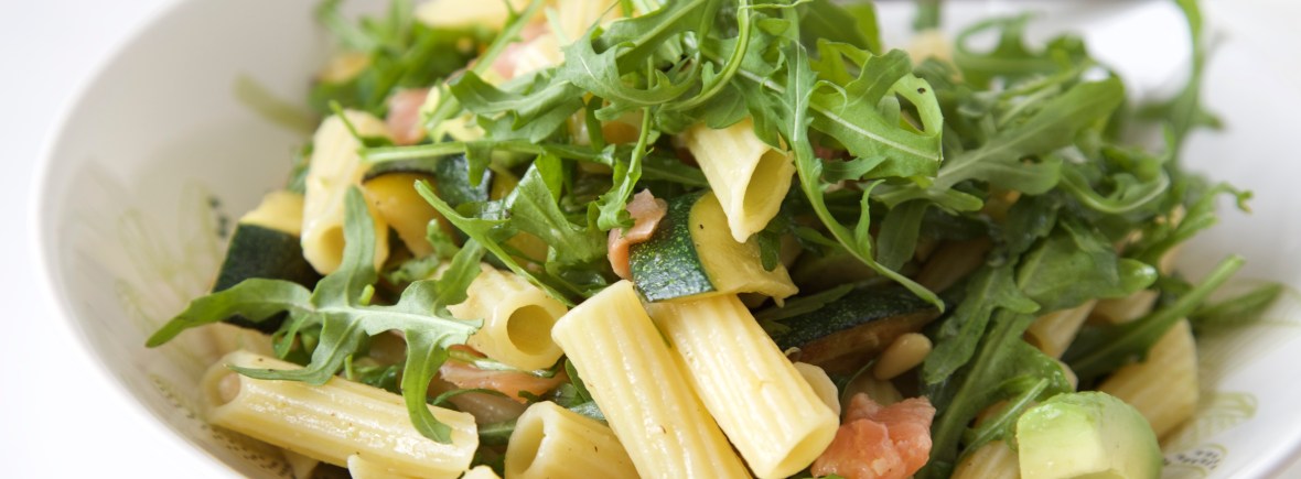 1. Kook de pasta volgens de verpakking en spoel koud na. 2. Snijd de courgette in blokjes van ongeveer 2 bij 2 cm en bak in 10 min goudbruin in de olijfolie. Laat even wat afkoelen. 3. Snijd de plakjes zalm in reepjes en de avocado in blokjes. 4. Meng in een kommetje het citroensap, de extra vergine olijfolie en voeg naar smaak versgemalen peper en zout toe. 5. Doe de pasta in een grote kom en meng er voorzichtig de rucola, avocado, zalm, courgette en de dressing doorheen. 6. Rooster kort de pijnboompitten in een koekenpan en strooi dit over de salade heen. Eventueel afmaken de hennepzaadjes. Eet smakelijk!