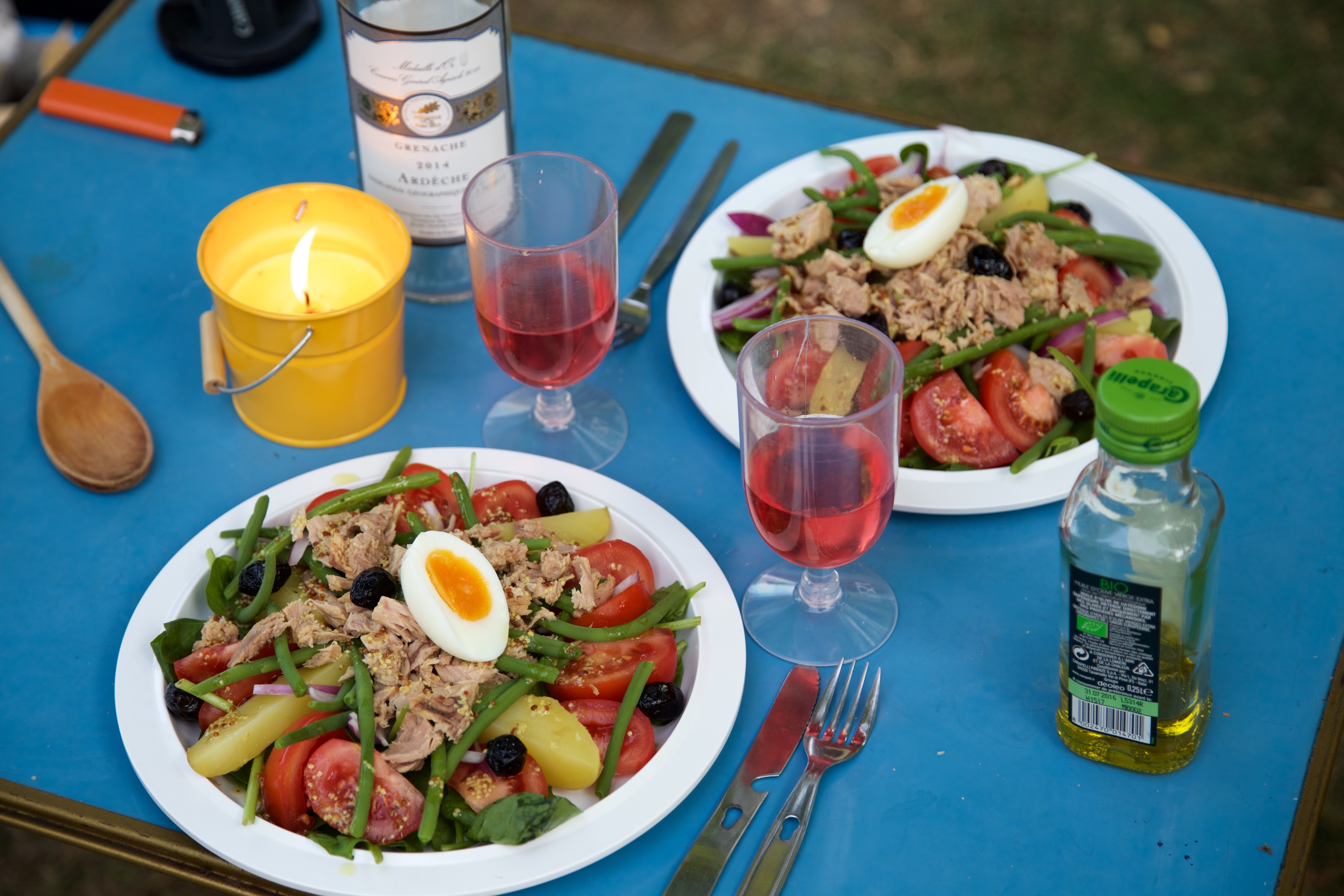 De foto’s van het eten zijn gemaakt op de camping (hulde aan plastic wijnglazen) en de salade is bereid met behulp van een camping-gasstelletje en een klein snijplankje. Dat bewijst ook maar weer hoe vreselijk eenvoudig deze klassieke salade wel niet is!